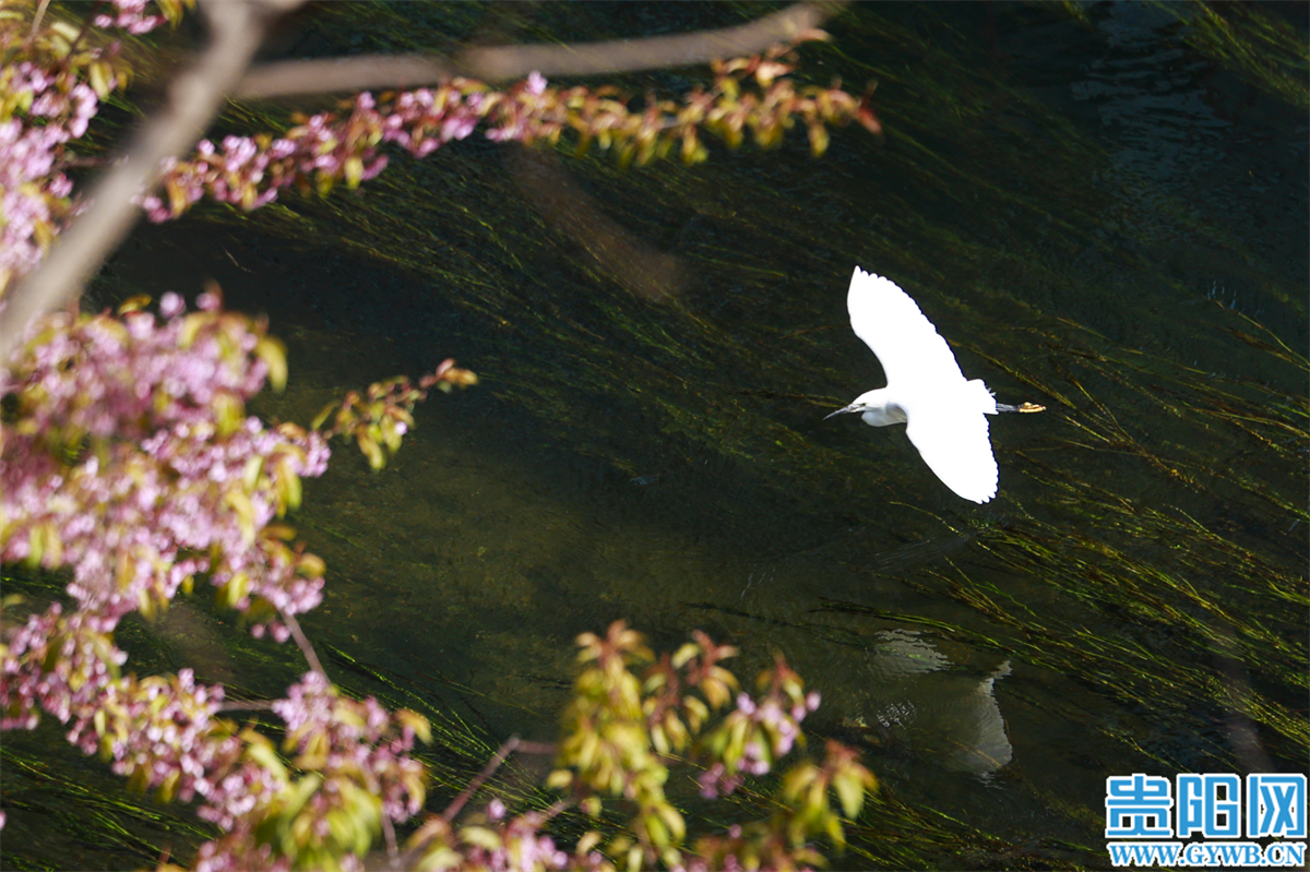 花丛间,小鸟穿梭嬉戏,清脆啼鸣不绝于耳;蜜蜂忙着采蜜,嗡嗡声为这幅美景增添灵动生机。河面上,白鹭时而展翅低飞,时而驻足栖息,尽显生态和谐。优美的自然景致吸引了众多摄影爱好者前来赏花拍照。